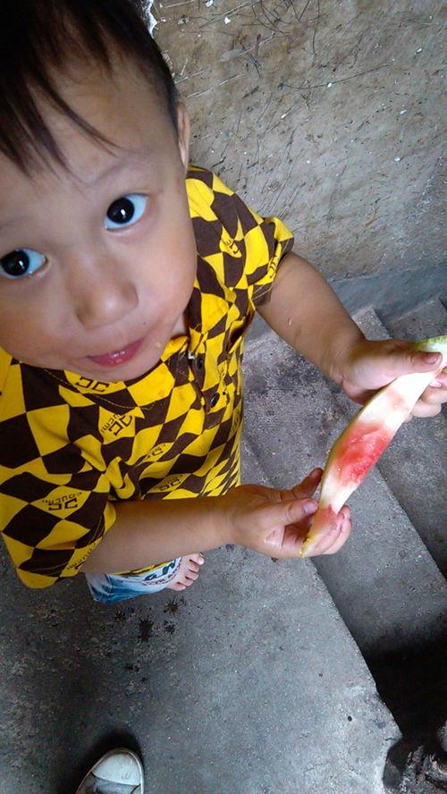 你看他那样子,手里拿着一个超大的西瓜,一边啃着,一边还不忘四处张望,好像在寻找着什么。我问他:“弟弟,你这是在找什么宝贝吗?”他笑着回答:“嘿我在找瓜田里的‘瓜王’呢!”